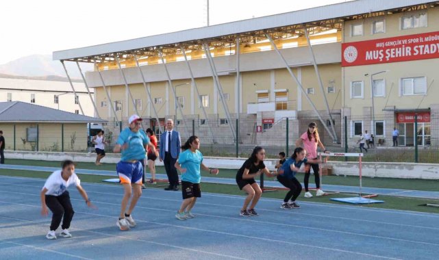 Muş'ta Gençlik ve Spor Bakanlığı Yaz Spor Okulları kapsamında eğitim alan genç sporcular, 1071 Sultan Alparslan Spor Kompleksi Atletizm Tartan Pisti'nde antrenmanlarını sürdürüyor. Farklı yaş gruplarından çocuk ve gençlerin katıldığı antrenmanlarda sporcular, antrenörler eşliğinde dayanıklılık, hız ve koordinasyon çalışmaları yapıyor. Yaz tatilini sporla değerlendiren gençler, fiziksel gelişimlerini artırıyor. Gençlik ve Spor İl Müdürü Yusuf Kılıç, sporcuların gösterdiği gayreti değerlendirerek, "Atletizm gibi temel branşlarda kazanılan disiplin, gençlerimizin gelecekte büyük başarılara ulaşmasına katkı sağlayacak. Buradaki çalışmalar hem sağlıklı yaşam hem de Türk sporunun geleceği için çok kıymetli" dedi.