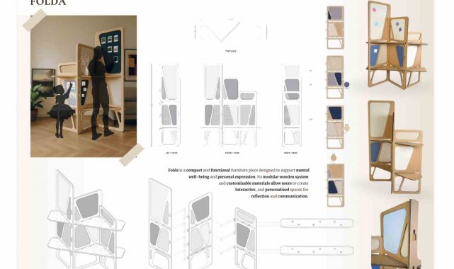 İç Mimarlık ve Çevre Tasarımı Bölümü öğrencileri Aycan Dede ve İrem Türker, "Mobilya ve Aydınlatma Tasarımı" kategorisinde geliştirdikleri "Folda" adlı projeleriyle 60 proje arasından üçüncülük ödülü kazandı. Zihinsel iyi oluşu ve kişisel ifadeyi destekleyen kompakt bir mobilya olarak tasarlanan Folda, kullanıcıların not, fotoğraf ve kişisel objelerini sergileyebileceği pano yüzeyleriyle işlevselliği ve bireysel deneyimi bir araya getiriyor. Farklı boyut seçenekleri sayesinde çeşitli yaşam ve çalışma alanlarına uyum sağlayan tasarım, kullanıcıya kendine ait kişisel bir mekan oluşturma imkânı sunuyor.