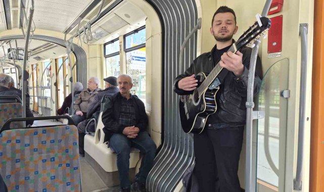 Eskişehir'de bindiği tramvayda gitarıyla küçük bir konser veren genç müzisyen, yolculara keyifli anlar yaşattı.