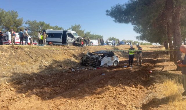 Şanlıurfa'nın Ceylanpınar ilçesinde yolcu minibüsüyle çarpışan otomobilin sürücüsü yanarak hayatını kaybederken, minibüsteki 14 kişi yaralandı.