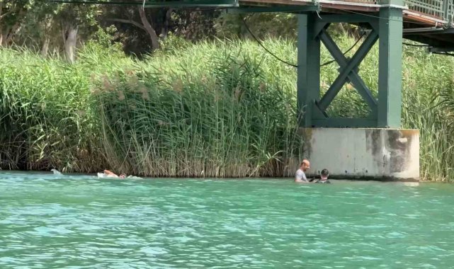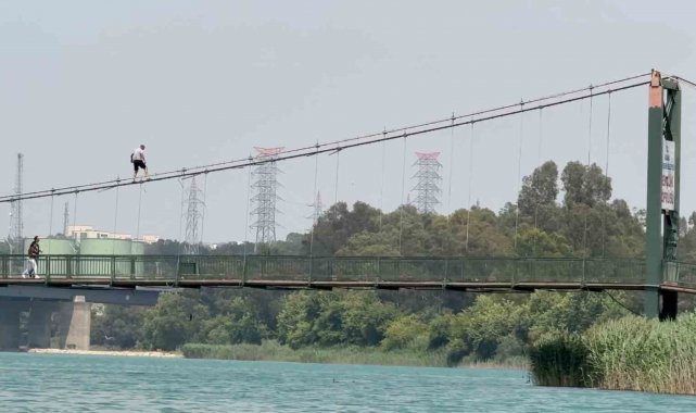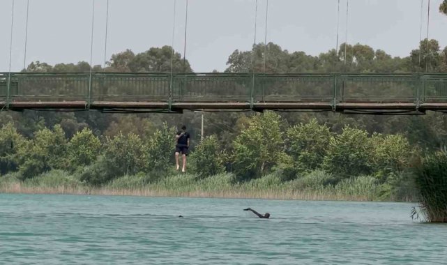 Adana'da etkili olan sıcaklar nedeniyle gençler, serinlemek için Seyhan Nehri üzerindeki Gençlik Köprüsü'nün halatlarına tırmanarak suya atladı. Tehlikeli o anlar ise kameraya yansıdı.