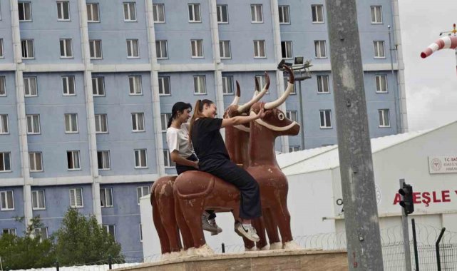 Üniversite öğrenimlerini tamamlamak için Sivas'a giden iki arkadaş, mezun olduktan sonra yaptıkları ile dikkat çekti. Sivas Cumhuriyet Üniversitesi girişinde bulunan ve ünlü ikiz boğa figürünün heykeline çıkan iki kafadar, görenleri gülümsetti. Sarissa Antik Kenti kazılarında, yan yana bir vaziyette bulunan ve aslı Sivas Arkeoloji Müzesi'nde sergilenen heykele çıkarak mezuniyetlerini kutlamak istediklerini ifade eden iki arkadaş, "Gitmeden önce şehri biraz daha yüksekten izleyelim dedik. Buradan herkesi iyi izliyoruz. Gayet eğlenceli" dedi.