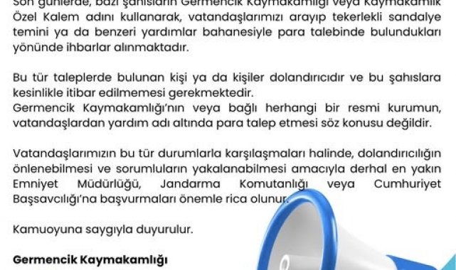Konuyla ilgili Germencik Kaymakamlığı'ndan yapılan açıklamada, "Son günlerde, bazı şahısların Germencik Kaymakamlığı veya Kaymakamlık Özel Kalem adını kullanarak, vatandaşlarımızı arayıp tekerlekli sandalye temini ya da benzeri yardımlar bahanesiyle para talebinde bulundukları yönünde ihbarlar alınmaktadır. Bu tür taleplerde bulunan kişi ya da kişiler dolandırıcıdır ve bu şahıslara kesinlikle itibar edilmemesi gerekmektedir. Vatandaşlarımızın bu tür durumlarla karşılaşmaları halinde, dolandırıcılığın önlenebilmesi ve sorumluların yakalanabilmesi amacıyla derhal en yakın Emniyet Müdürlüğü, Jandarma Komutanlığı veya Cumhuriyet Başsavcılığı'na başvurmaları önemle rica olunur. Kamuoyuna saygıyla duyurulur" ifadelerine yer verildi.