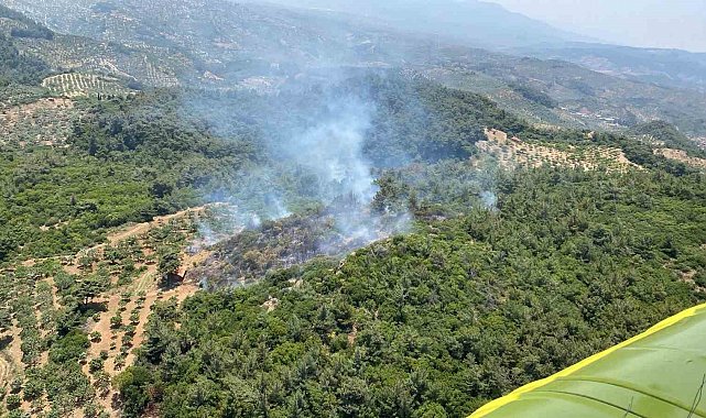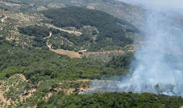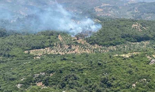 Aydın'ın Germencik ilçesinde ormanlık alanda meydana gelen orman yangını çıkarken, yangının söndürülmesi için ekiplerin karadan ve havadan müdahaleleri sürüyor.