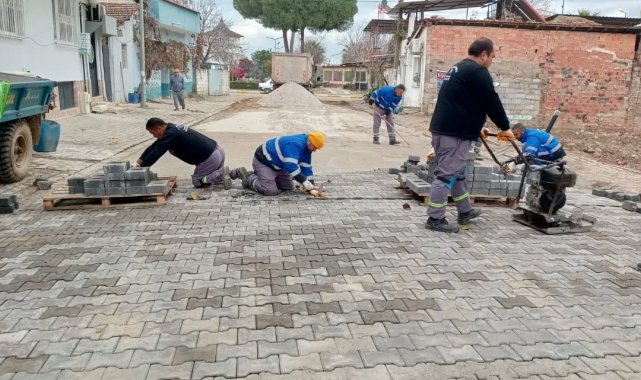 Aydın'ın Germencik ilçesinde sahaya inen belediye ekipleri, İstasyon Mahallesi'nde parke taşı döşeme çalışmalarına devam ediyor.