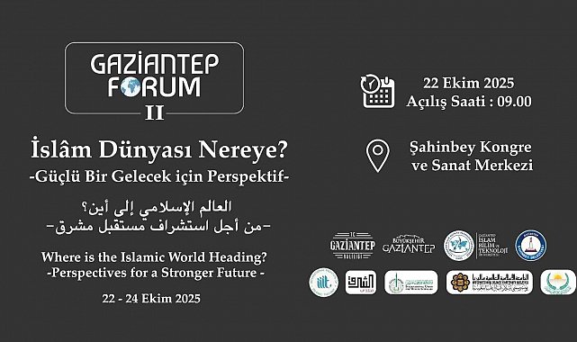 Gaziantep İslam Bilim ve Teknoloji Üniversitesi tarafından düzenlenen Gaziantep Forum II, bu yıl "İslâm Dünyası Nereye? - Güçlü Bir Gelecek için Perspektif" temasıyla gerçekleştirilecek. İslâm dünyasının mevcut meseleleri, gelecek vizyonu ve küresel ölçekteki rolünün ele alınacağı Gaziantep Forum'a dünyanın dört bir yanından akademisyenler, araştırmacılar, sivil toplum kuruluşları ve ilgili paydaşlar katılım sağlayacak. Forum 22-24 Ekim 2025'te Şahinbey Kongre ve Sanat Merkezi'nde yapılacak.