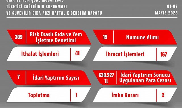 İl Tarım ve Orman Müdürlüğü Gıda ve Yem Şube Müdürlüğü'nün tüketici sağlığının korunması ve güvenilir gıda arzı amacıyla gerçekleştirdiği denetimler sürüyor. Bu çerçevede, 1-7 Mayıs tarihleri arasında yapılan çalışmalarla ilgili rapor Eskişehir Valiliği tarafından paylaşıldı. Yayımlanan bilgilere göre; 309 risk esaslı gıda ve yem işletme denetimi, 19 numune alımı, 41 ithalat ve 167 ihracat işlemleri gerçekleştirildi. Yapılan çalışmalar sonucunda; 7 idari yaptırım, 1 toplatma ve 2 imha kararı verildi, toplam 630 bin 227 TL para cezası uygulandı. Ayrıca, 2 kamuoyu duyurusu yapıldığı belirtildi.