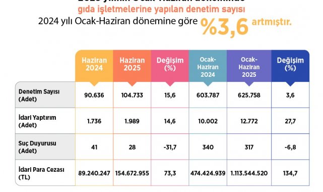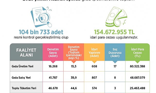 Tarım ve Orman Bakanlığı Gıda ve Kontrol Genel Müdürlüğü, sosyal medya hesabından 2025 yılı haziran ayı gıda işletmeleri yurt içi denetim sonuçları ile ilgili paylaşımda bulundu. Gıda ve Kontrol Genel Müdürlüğü, 104 bin 733 gıda işletmesinde denetim yapıldığını ve bin 989'una idari yaptırım uygulandığını duyurdu. Aynı zamanda toplam 154 milyon 672 bin 955 lira idari para cezası verildiğini açıkladı.