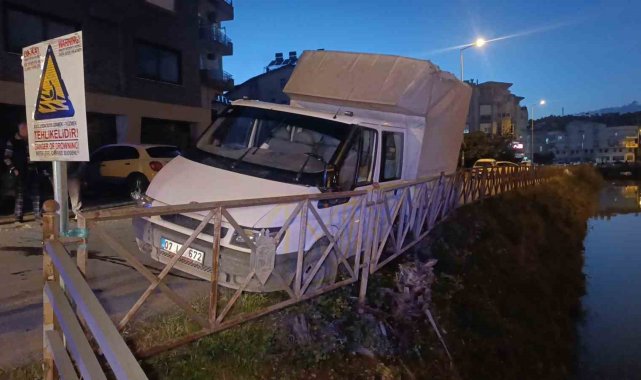 Antalya'nın Manavgat ilçesinde park halindeki otomobile çarptıktan sonra uzaklaşmak isteyen kamyonet, demir korkuluklar sayesinde sulama kanalına düşmekten kurtuldu. Kazanın ardından çevredeki vatandaşlar tarafından güçlükle araçtan indirilen araç sürücüsü, 112 Sağlık ekibinin olay yerindeki müdahalesinin ardından hastaneye kaldırıldı. Hastanede kan testi ile yapılan kontrolde 3,35 promil alkollü çıkan kamyonet sürücüsünün ehliyetinin olmadığı,