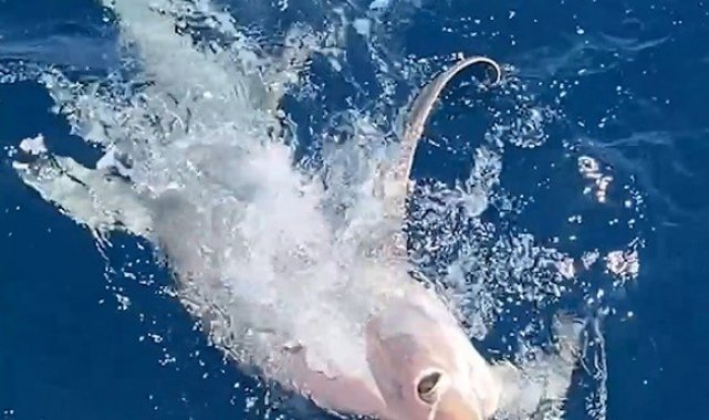Gökçeada ilçesinde balıkçı İlker Özdemir, balık avlamak için arkadaşlarıyla birlikte tekneyle denize açıldı. İlker Özdemir'in Kaleköy açıklarında kılıç balığı avı sırasında paragat oltasına yaklaşık 6 metre boyunda, sapan köpekbalığı takıldı. Köpek balığının o anları cep telefonuyla kaydedildi.