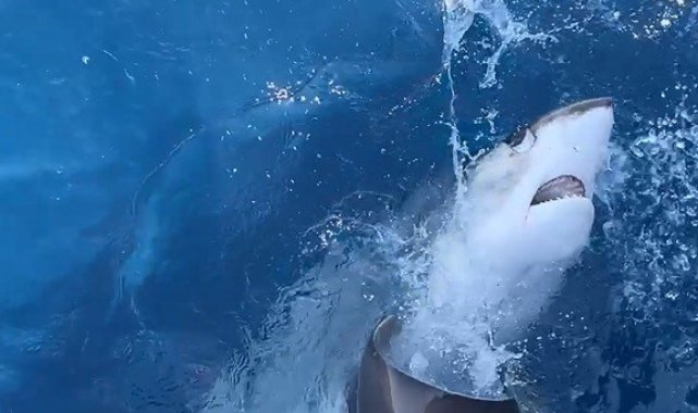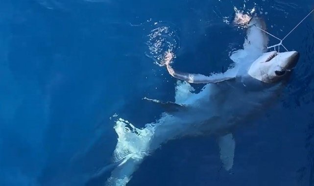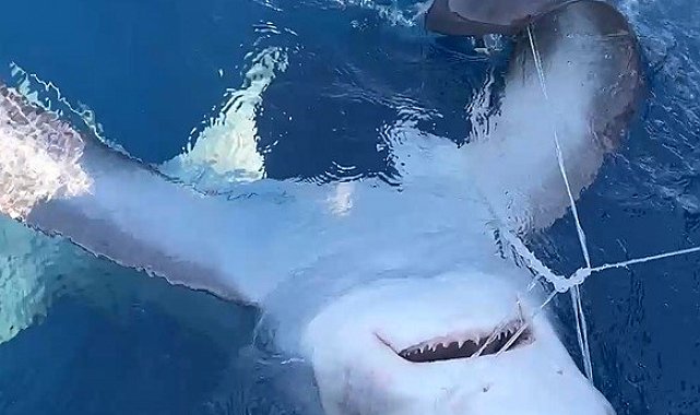 Çanakkale'nin Gökçeada ilçesinde, geçtiğimiz yıllarda Yunanistan Sahil Güvenlik unsurlarına kafa tutan Türk balıkçı İlker Özdemir'in kılıç balığı avı sırasında, oltasına yaklaşık 6 metre boyunda sapan köpek balığı takıldı. Köpek balığı tekrar doğal ortamı olan denize bırakıldı.