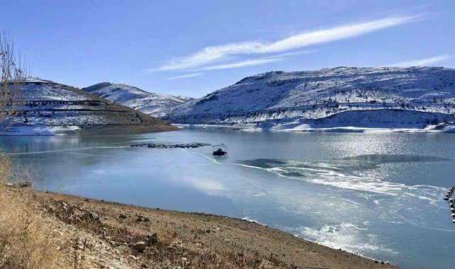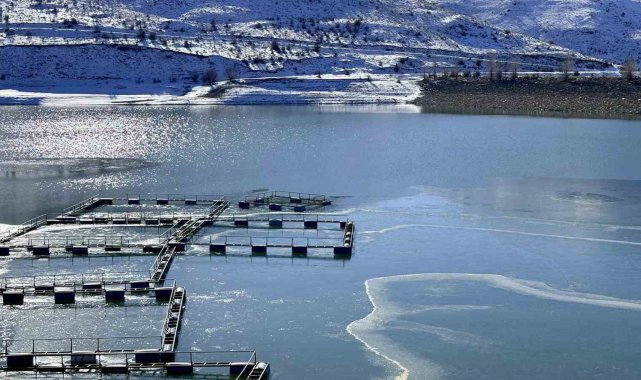 Kış mevsiminin kendini iyiden iyiye hissettirdiği bölgede, gece saatlerinde düşen hava sıcaklıkları göletin yüzeyinin donmasına neden oldu. Su ürünleri kafeslerinin buzla çevrildiği gölette, donan su yüzeyi dikkat çekiyor.