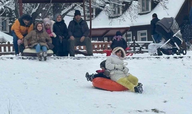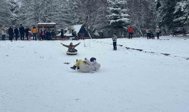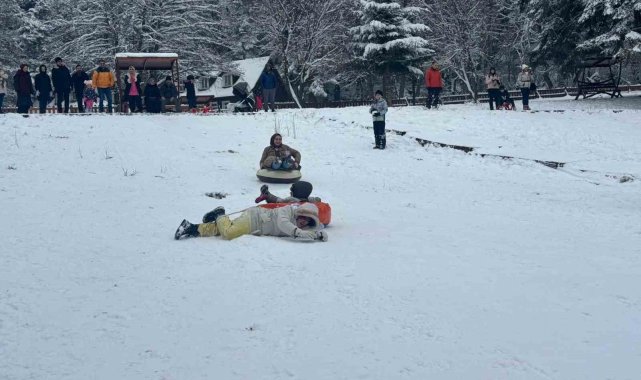 Kent merkezine 13 kilometre uzaklıkta bulunan Bolu'nun incisi olarak tabir edilen Gölcük Tabiat Parkı, hafta sonu tatilinde ziyaretçilerle doldu. Geçtiğimiz 3 gün boyunca aralıklarla kar yağışının etkili olduğu tabiat parkında kar kalınlığı 10 santimetreye ulaştı. Göl kıyısında bulunan rampada tabiat parkına gelen tatilciler tarafından kayak pisti oluşturuldu. Şambrellerini eline alan tatilciler, Gölcük'ün yolunu tuttu. Eğlenceleri anlar yaşayan tatilciler, şambrellerle kayarak tatilin tadını çıkarttı.