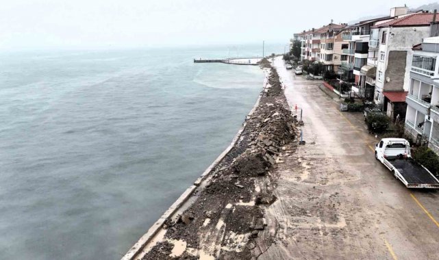 Gölcük'e bağlı Ulaşlı sahilinde olumsuz hava şartlarında denizin yükselmesi sonucu oluşan su baskınlarını önlemek amacıyla set inşa ediliyor.