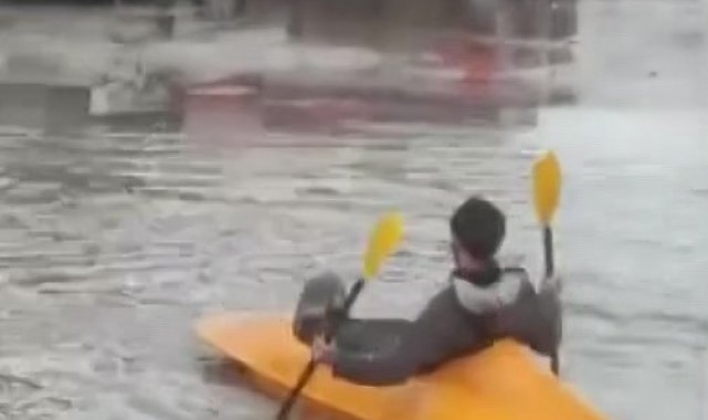 Adana'da sağanak yağış sonrası sokaklar adeta göle dönerken bir vatandaşın kanosuyla sokakta gezmesi anbean cep telefonuyla görüntülendi.