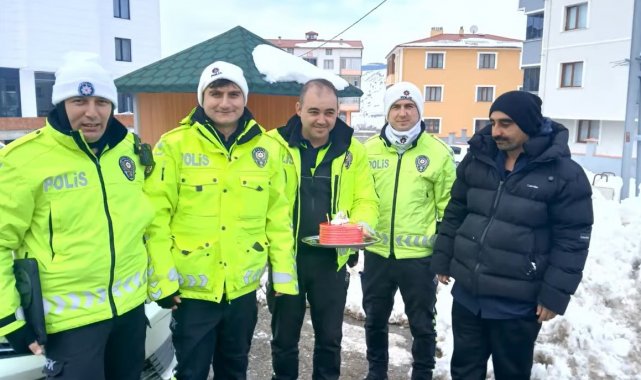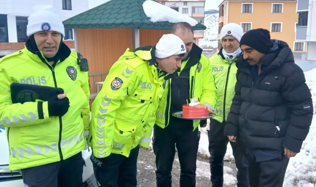 İlçedeki uygulama noktasında gerçekleştirilen sürpriz kutlamada polis memurunun doğum günü, ekip arkadaşlarınca eksi 15 derece hava sıcaklığında pasta kesilerek kutlandı.