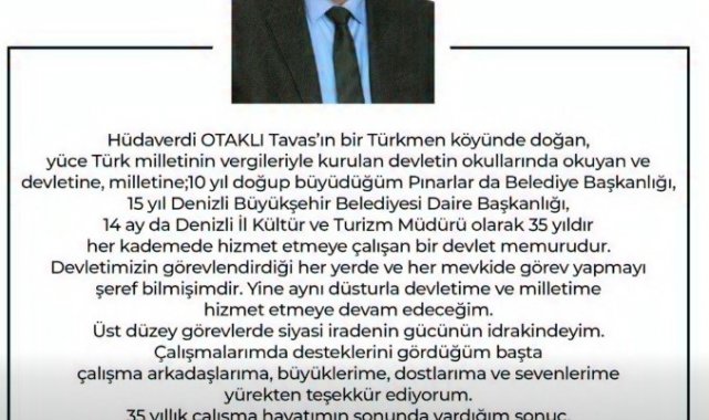 Sitem ve imalı bir mesaj yayınlayan Otaklı, "Hüdaverdi Otaklı, Tavas'ın bir Türkmen köyünde doğan, yüce Türk milletinin vergileriyle kurulan devletin okullarında okuyan ve devletine, milletine; 10 yıl doğup büyüdüğüm Pınarlar'da Belediye Başkanlığı, 15 yıl Denizli Büyükşehir Belediyesi Kültür ve Sosyal İşler Daire Başkanlığı, 14 ay da Denizli İl Kültür ve Turizm Müdürü olarak 35 yıldır her kademede hizmet etmeye çalışan bir devlet memurudur. Devletimizin görevlendirdiği her yerde ve her mevkide görev yapmayı şeref bilmişimdir. Yine aynı düsturla devletime ve milletime hizmet etmeye devam edeceğim. Üst düzey görevlerde siyasi iradenin gücünün idrakindeyim. Çalışmalarımda desteklerini gördüğüm başta çalışma arkadaşlarıma, büyüklerime, dostlarıma ve sevenlerime yürekten teşekkür ediyorum. 35 yıllık çalışma hayatımın sonunda vardığım sonuç, merhum Cumhurbaşkanımız Süleyman Demirel'in dediği gibi 'Vefa' İstanbul'da sadece bir semtin adıymış. Saygılarımla" ifadelerini kullandı.