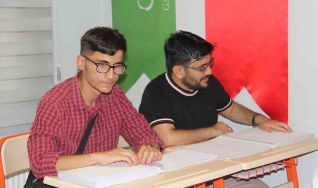 Gaziantep'te erkek öğrenciler için açılan kursa katılan görme engelliler, Braille alfabesiyle Kur'an-ı Kerim'i öğrenmenin sevincini yaşıyor.