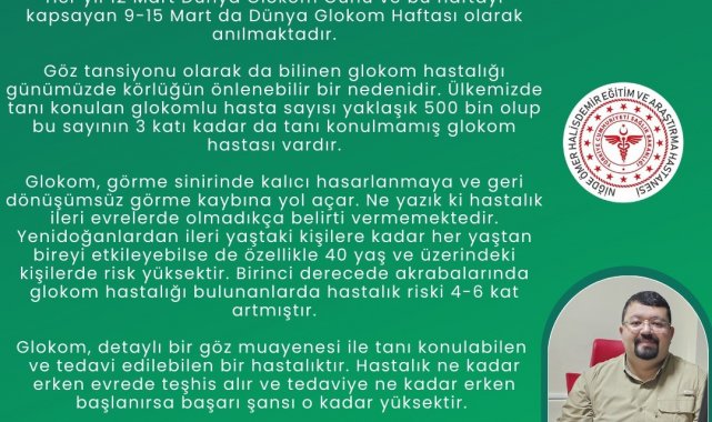 12 Mart Dünya Glokom Günü nedeniyle açıklama yapan Göz Hastalıkları Uzmanı Dr. Öğr. Üyesi Ömer Özer göz tansiyonu olarak da bilinen glokomun, önlenebilir körlük nedenlerinden biri olduğunu söyledi.