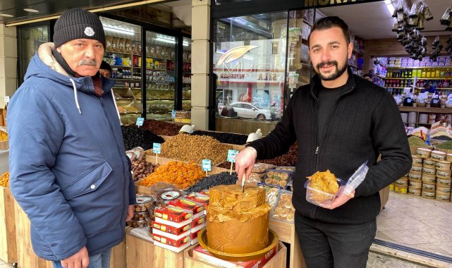 Gençlere kahvaltılık çikolata yerine katı pekmez yemelerini öneren Dolap, "Katı pekmez, bizim çocukluğumuzda adeta kahvaltılık çikolata gibi tüketilirdi. Bizim yaşıtımız çocuklar bu besini daha fazla tüketirdi. Ben özellikle sürülebilir çikolata yerine katı pekmezin tercih edilmesini öneriyorum. Kış aylarında vücudu sıcak tutan bu besin, sahurda ve kahvaltıda oldukça besleyici bir seçenek. Genellikle ekmekle tüketilse de, cevizle birlikte yiyenler de var. Katı pekmez, pekmez toprağı ile mayalanma sürecinin uzaması sonucu bu kıvamı alıyor. Kış aylarında oldukça rağbet gören bu ürün, kan ısısını düzenleyip vücudu soğuktan koruyor. Aynı zamanda bağışıklık sistemini güçlendirerek kanser hastaları için de faydalı bir besin olduğu araştırmalar sonucu söyleniyor. Şu anda katı pekmezin kilogram fiyatını 240 liradan satıyoruz. Yeni nesillere fındık kreması, kahvaltılık çikolata yerine katı pekmez yemelerini tavsiye ediyorum" dedi.