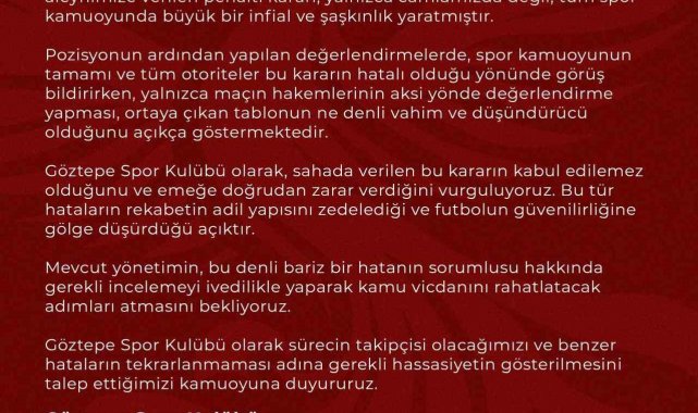 Karşılaşmanın ardından hakemin bu kararı büyük tartışma oluştururken, Göztepe de yazılı bir açıklama yayımladı. Sarı-kırmızılı kulüp, verilen penaltının yalnızca kendi camialarında değil, tüm spor kamuoyunda infial oluşturduğunu belirtti. İzmir ekibi ayrıca sürecin takipçisi olacaklarını vurgulayarak, benzer hataların tekrarlanmaması adına gerekli hassasiyetin gösterilmesini talep etti.