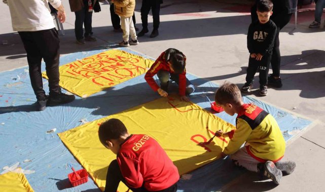 Çocuklar pankart yapmaktan memnun