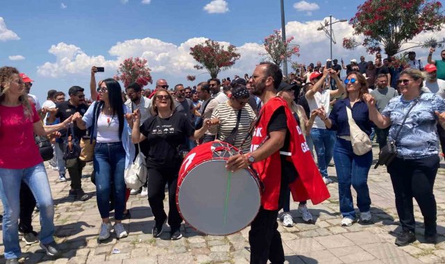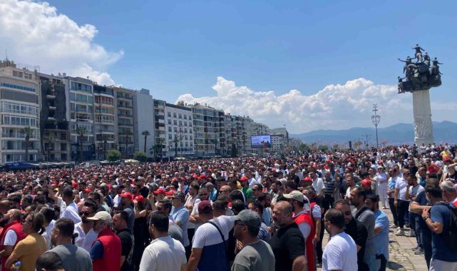 Gündoğdu Meydanı'nda açıklama yapan DİSK Ege Bölge Temsilcisi Memiş Sarı, "Bu işçiler Cumhuriyet Halk Partisi'ne oy veriyor. Cumhuriyet Halk Partisi'nde de grev yapıyor. Çünkü işçiler haklı mücadelesinde grev yapar. 25 yıldır yönettiğiniz bu kentte vapurlar çalışıyorsa, otobüsler çalışıyorsa, trenler çalışıyorsa Çöpleriniz toplanıyorsa, her türlü sağlık hizmeti evinize geliyorsa bloklarınız değil bu işçiler yapıyor diyor. Ama buna rağmen beş tane büyük şirkette üç şirkete 80 bin TL 90 bin TL maaş vereceksiniz, Bize 45 bin lirayı reva göreceksiniz. Yok öyle yağma. Pazartesi herkes ailesine söylesin. Başka işte çalışıyorsa işe gitmesin, rapor alsın. Eşleriniz, çocuklarınız, ailelerinizle birlikte yüzbinler İzmir'i kırmızıya boyayacağız. Buradan tekrar söylüyorum 80 bin TL'ye biz imza atarız" ifadelerini kullandı.