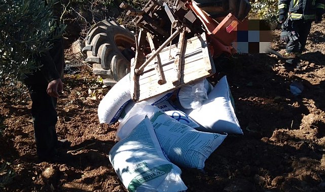 Gübre taşıyan traktör devrildi, sürücü altında kaldı