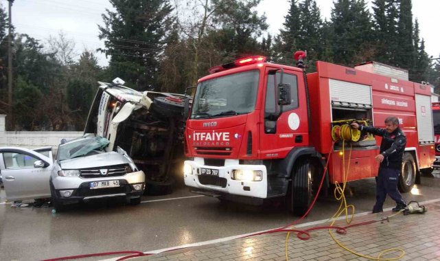 Antalya'da gübre yüklü kamyon kavşakta bir otomobili önüne alıp metrelerce sürükledikten sonra park halindeki belediye otobüsüne çarpıp devrildi. Kazada kamyonun altına kalan otomobilde sıkışan kadın sürücü, itfaiye ekipleri tarafından kurtarılarak sağlık ekiplerine teslim edildi.