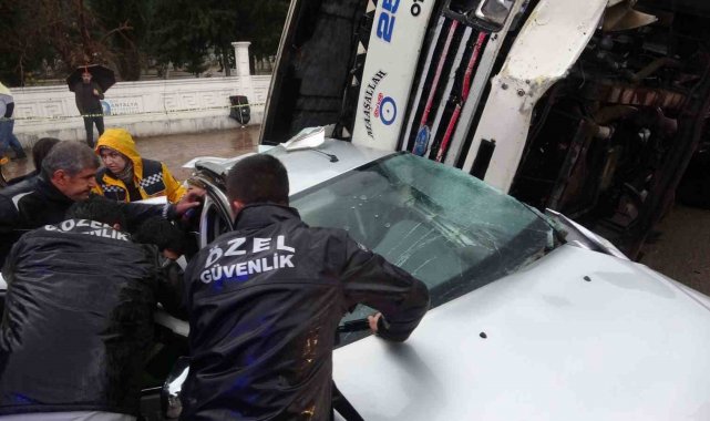 Gübre yüklü kamyon çarpıştığı otomobili metrelerce sürükleyip üzerine devrildi