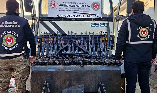 Akçakale Gümrük Muhafaza Kaçakçılık ve İstihbarat Müdürlüğü ekipleri tarafından, Türkiye'ye geçiş yapmaya çalışan kamyonun yakıt deposunda 52 uzun namlulu silah ele geçirildi.
