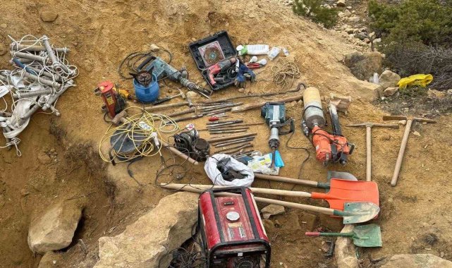 Olay yerinde yapılan aramalarda; 3 cep telefonu, 1 matkap ve çantası, 1 carot makinesi, 1 jeneratör, 2 hilti, 1 vinç, çeşitli inşaat ve kazı ekipmanları ile birlikte toplam 114 adet kaçak kazı malzemesi ele geçirilerek muhafaza altına alındı.