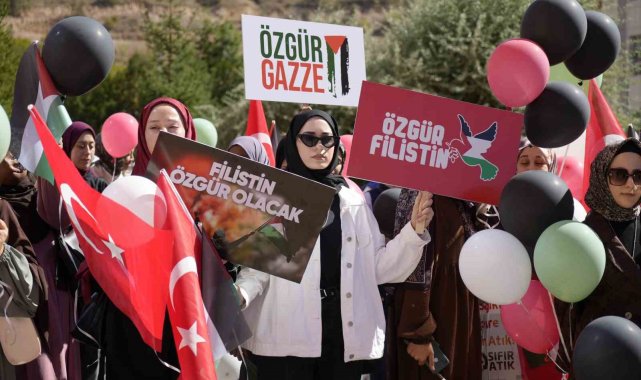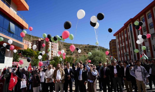 Gümüşhane Üniversitesi öğrencileri, Gazze'de yaşanan insanlık dramına dikkat çekmek amacıyla "Kampüsten Gazze'ye Tek Yürek" etkinliğinde bir araya gelerek Filistin bayrağının renklerinden oluşan onlarca balonu gökyüzüne bıraktı.
