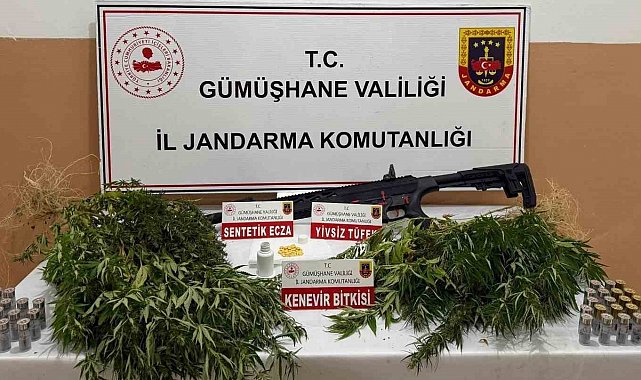 Gümüşhane İl Jandarma Komutanlığı ekiplerinin düzenlediği 2 ayrı operasyonda sahte içki yapımında kullanılan etil alkol, ekili kenevir, sentetik ecza ve ruhsatsız silah ele geçirildi. Olaylarla ilgili iki şüpheli hakkında adli tahkikat başlatıldı.