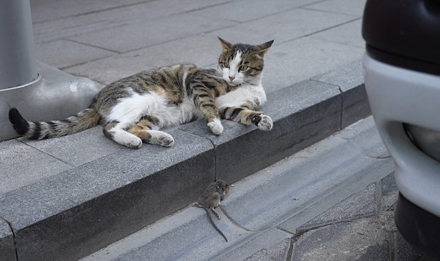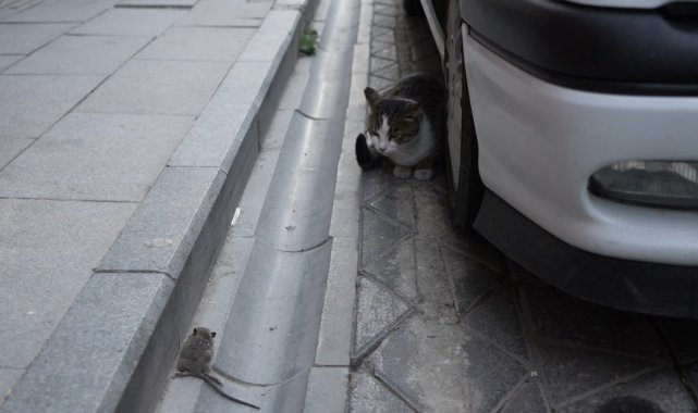 Cumhuriyet Caddesi üzerindeki bir iş yerinin önünde kaydedilen görüntülerde kedinin yakaladığı fareyi hemen öldürmek yerine bir süre serbest bırakarak yeniden yakaladığı görüldü. Doğal av içgüdüsüyle hareket eden kedinin o anları kameralara yansıdı. Fareyi havaya fırlatarak bir süre oynayan kedi, daha sonra sıkılarak fareyi bıraktı.