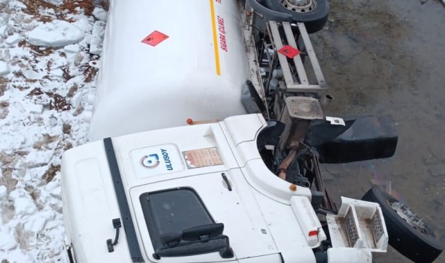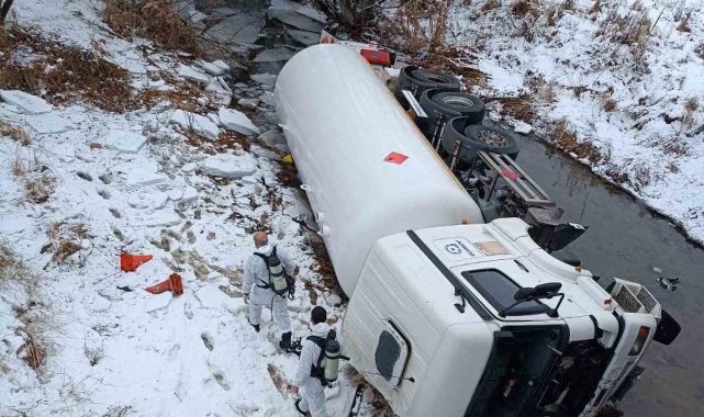 Gümüşhane'de buzlanan yolda kontrolden çıkan LPG yüklü tanker dere yatağına devrildi.