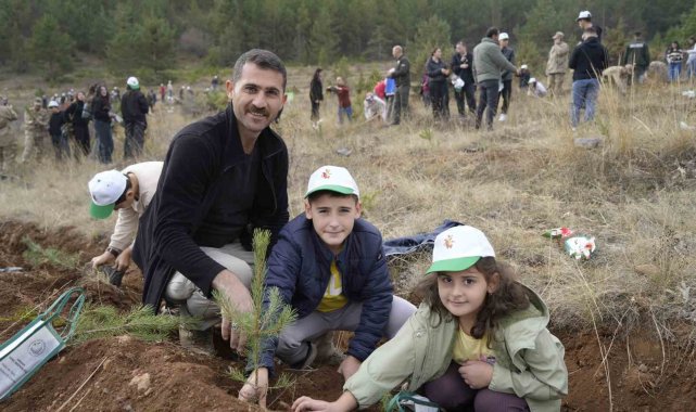 Gümüşhane'nin Karşıyaka Mahallesi Mesire Alanı'nda düzenlenen 11 Kasım Milli Ağaçlandırma Günü etkinliğinde sarıçam fidanları toprakla buluşturuldu.