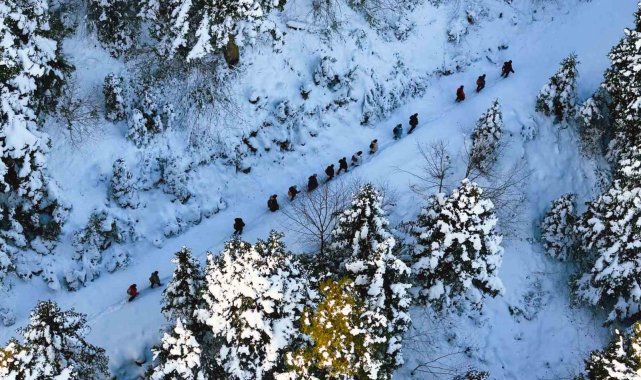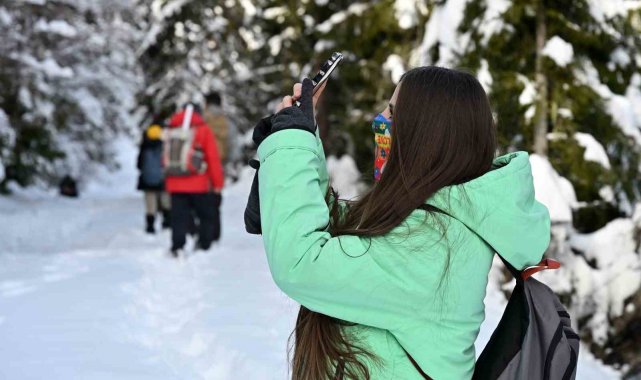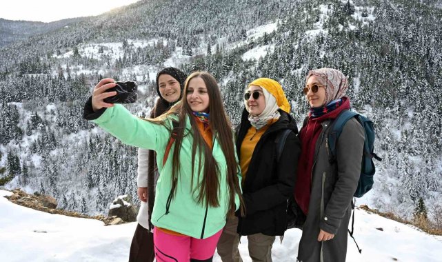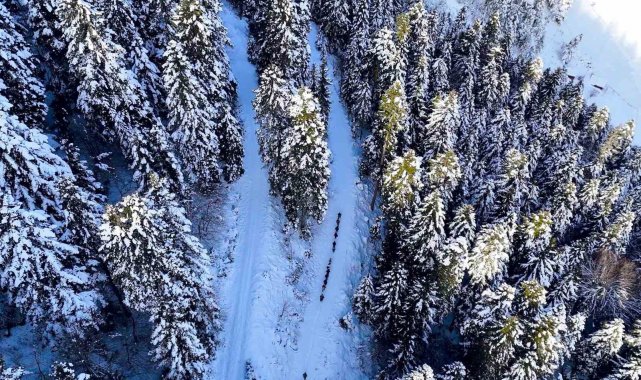 Kristalize kar taneleri eşliğinde ilerleyen ekip orman içindeki yatay geçişlerde çam ağaçlarının üzerine çöken kar yükününün oluşturduğu masalsı görüntüleri bol bol fotoğrafladı.