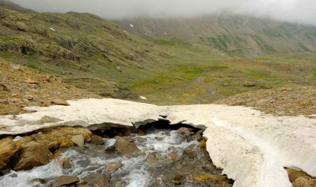 Haziran ayının son günlerine yaklaşılmasına rağmen parkın birçok noktasında hala kış mevsiminden kalma dev kar kütleleri gözlenirken, bu durum bölgeye farklı bir atmosfer katıyor.