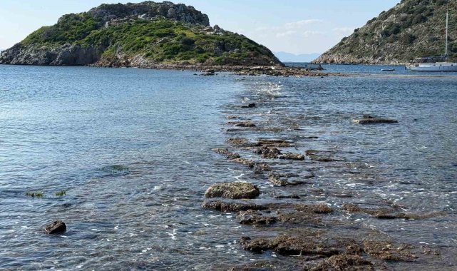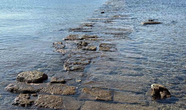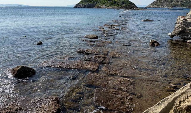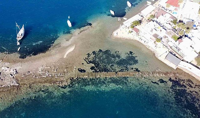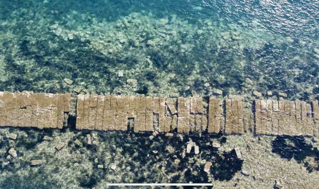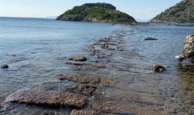 Muğla'nın Bodrum ilçesi Gümüşlük Mahallesi'nde bulunan ve Tavşan Adası'na kadar uzanan tarihi sur yolları, deniz çekilince yeniden ortaya çıktı. Halk arasında 'Kral Yolu' olarak bilinen ve 3 bin 500 yıl önce Myndos kentine ulaşımı sağlayan antik yol, dron ile görüntülendi.