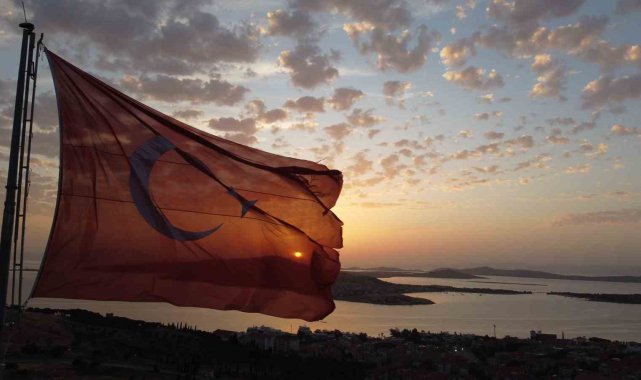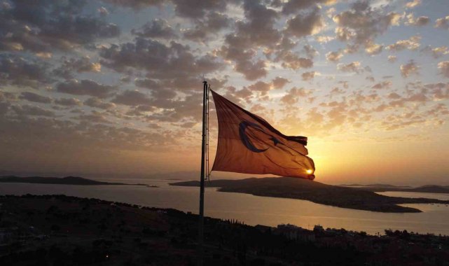 Edinilen bilgiye göre, Cennet Tepesi'nde dalgalanan dev Türk bayrağı, akşam saatlerinde güneşin batışıyla birlikte eşsiz bir manzara sundu. Gün batımıyla birlikte kızıllığa bürünen gökyüzü ve Ayvalık Adaları'nın siluetiyle birleşen bayrak görüntüsü, İhlas Haber Ajansı tarafından dron ile görüntülendi. Yerli ve yabancı turistlerin de ilgiyle izlediği bu anlar, izleyenlere görsel şölen yaşattı.