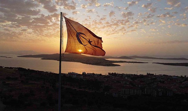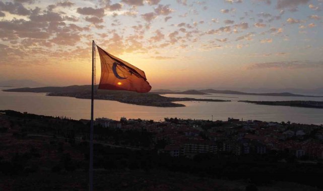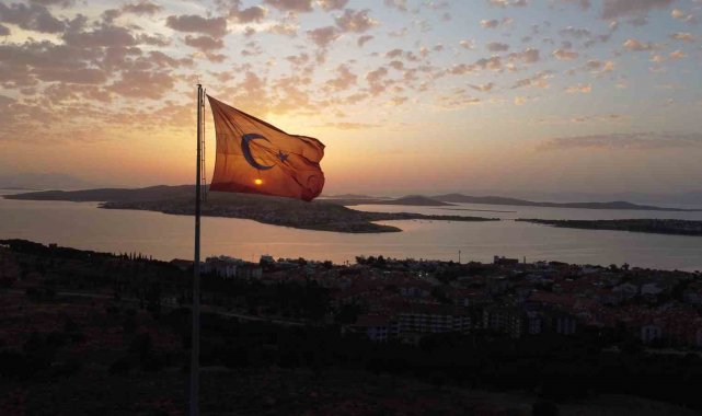 Gün batımında Türk bayrağı ve Ayvalık adaları görsel şölen oluşturdu