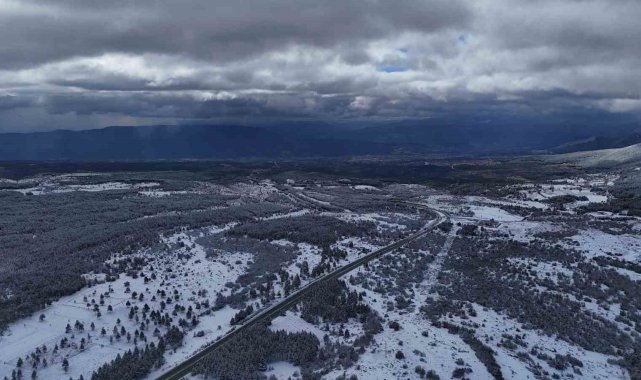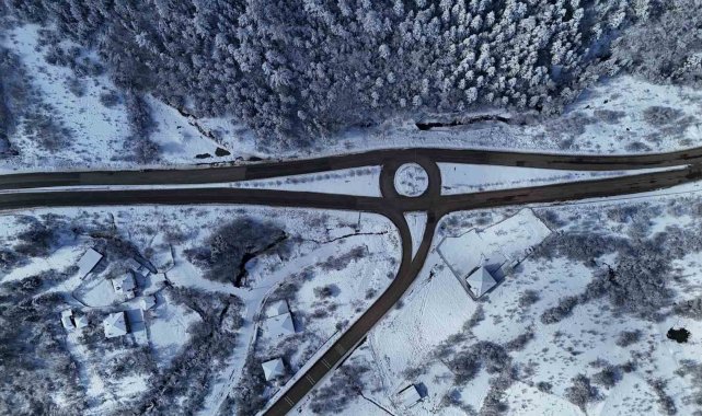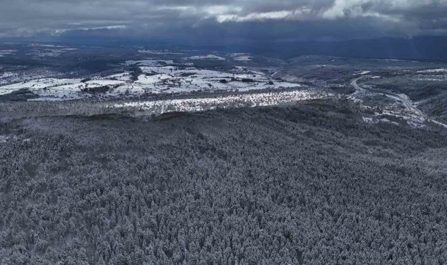 Karabük'ün yüksek kesimlerinde kar yağışı sonrası oluşan beyaz örtü, güneşin açmasıyla birlikte eşsiz manzaralar oluştururken o anlar dronla görüntülendi.