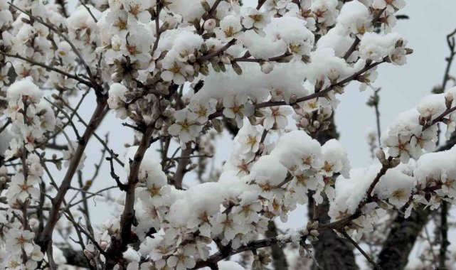 Çiçeklerle kaplı dalların üzerini örten kar tabakası, zirai açıdan olumsuzluk ihtimalini de beraberinde getirdi.