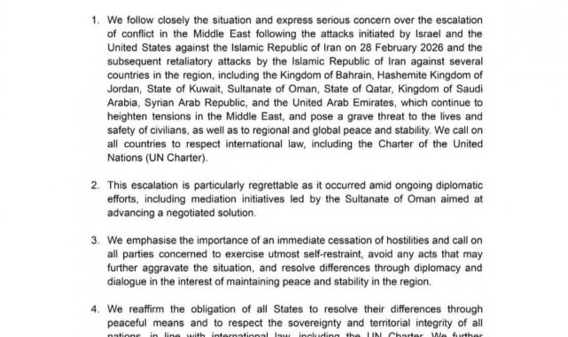 İran'ın misilleme saldırılarının Bahreyn, Ürdün, Kuveyt, Umman, Katar, Suudi Arabistan, Suriye ve Birleşik Arap Emirlikleri (BAE) dahil olmak üzere birçok ülkeyi etkilediği, bunun da Orta Doğu'daki tansiyonu daha da artırdığı kaydedildi. Açıklamada, sivillerin can güvenliğinin yanı sıra bölgesel ve küresel barış ile istikrarın ciddi tehdit altında olduğu vurgulanarak, tüm taraflara uluslararası hukuka ve Birleşmiş Milletler Şartı'na uygun hareket etme çağrısı yapıldı. Özellikle diplomatik çözüm çabalarının sürdüğü bir dönemde yaşanan tırmanışın "üzücü" olduğu belirtilen açıklamada, Umman öncülüğünde yürütülen arabuluculuk girişimlerine atıfta bulunuldu.