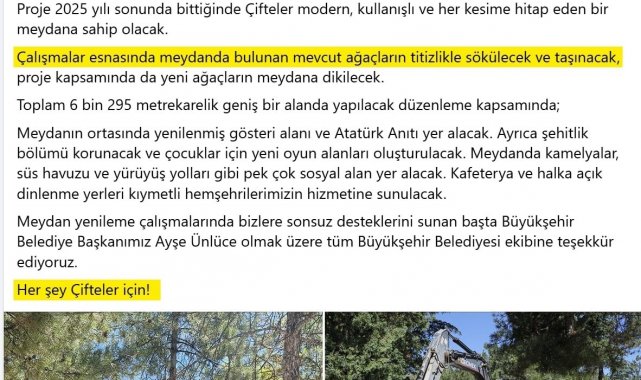"Cumhuriyet Meydanı yenileniyor, Çifteler'in çehresi değişiyor. Eskişehir Büyükşehir Belediyesi Park ve Bahçeler Dairesi Başkanlığı, ilçemiz Cumhuriyet Meydanı'nı baştan aşağı yeniliyor. Proje 2025 yılı sonunda bittiğinde Çifteler modern, kullanışlı ve her kesime hitap eden bir meydana sahip olacak. Çalışmalar esnasında meydanda bulunan mevcut ağaçlar titizlikle sökülecek ve taşınacak, proje kapsamında da yeni ağaçlar meydana dikilecek."