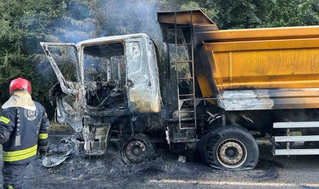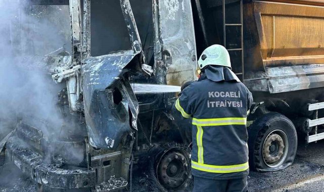 Kocaeli'nin Körfez ilçesinde alev alev yanan hafriyat kamyonu kullanılamaz hale geldi.