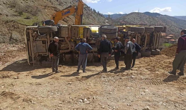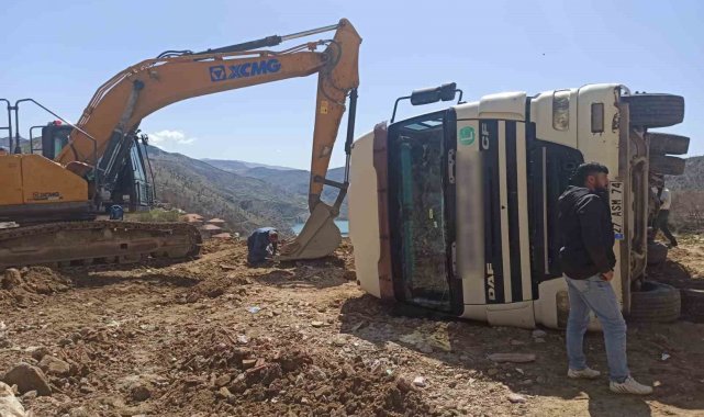 Adıyaman'ın Sincik ilçesinde boşaltım yapan hafriyat kamyonu devrildi.