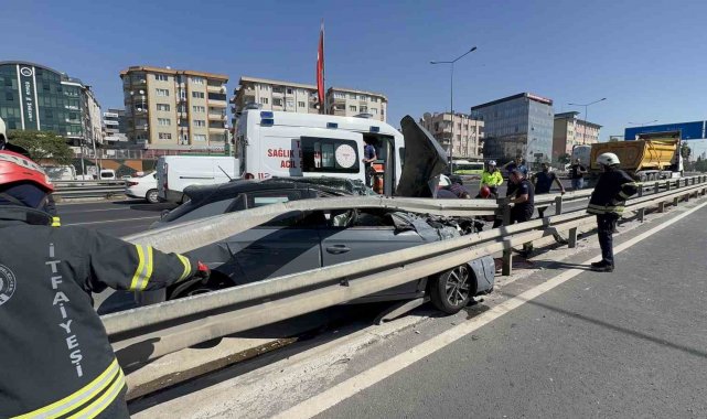 Hafriyat kamyonu ile çarpışan otomobil demir bariyerlerin altına girdi: 2 yaralı