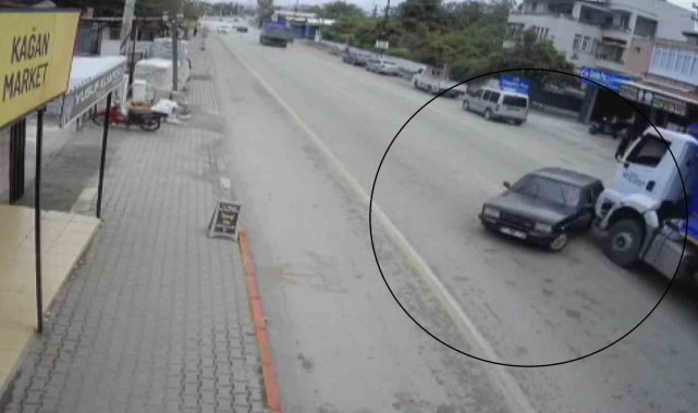 Kaza, Dörtyol ilçesi Musa Kazım Arıkan Bulvarı üzerinde yaşandı. Aynı istikamette ilerleyen hafriyat kamyonu, kör noktasına gelen Tofaş Fiat marka otomobili önüne alarak sürüklemeye başladı. Yaralananın olmadığı kazada oyuncak araba gibi kamyonun önünde sürüklenen araç, park halindeki motosiklete çarparak durabildi. Kaza anıysa çevrede bulunan iş yerinin güvenlik kamerasına yansıdı. Görüntülerde; otomobilin bir anda kamyonun önünde kalarak sürüklendiği görüldü.